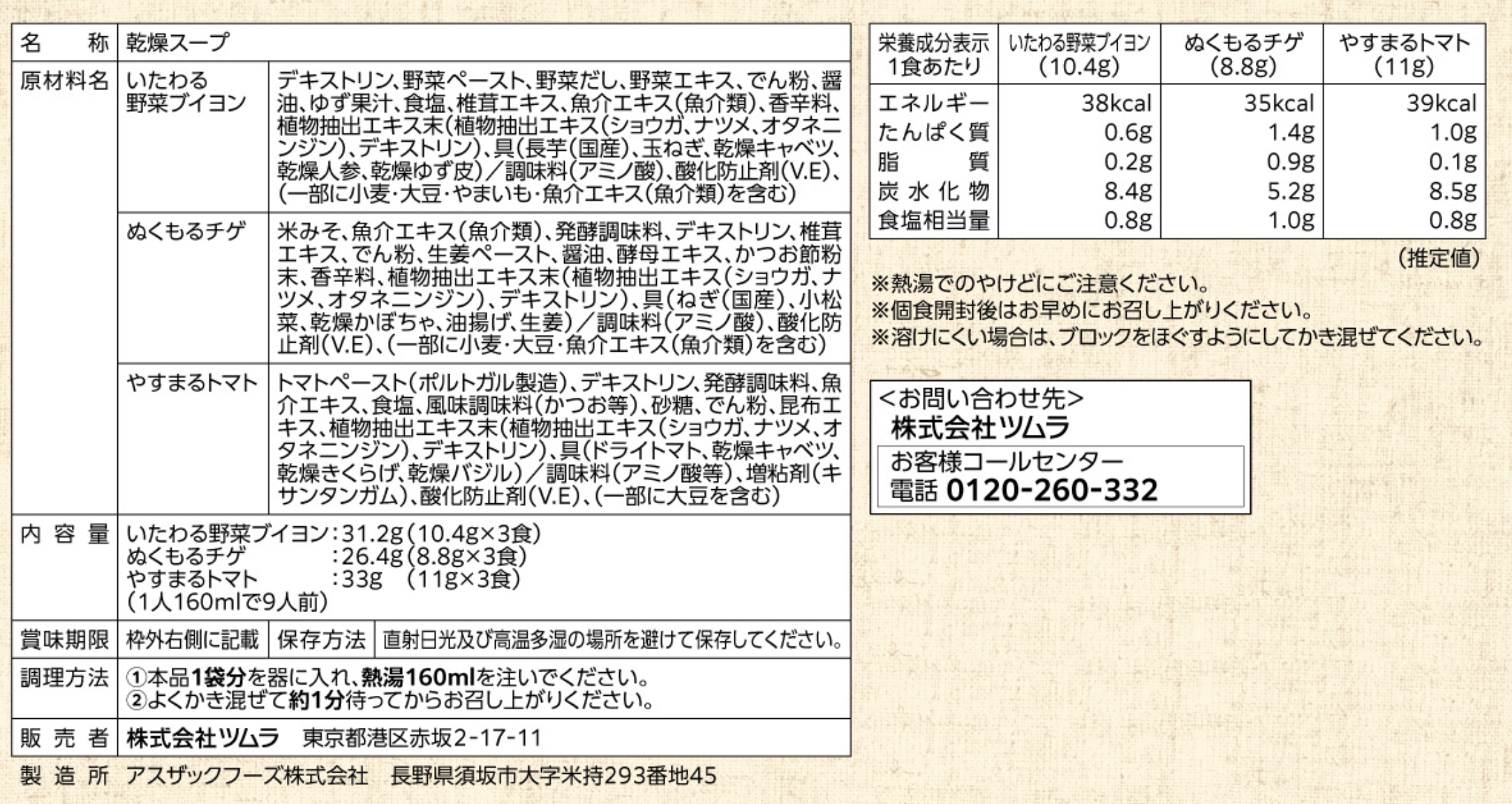 デキストリン、野菜ペースト、野菜だし、野菜エキス、でん粉、醤油、ゆず果汁、食塩、椎茸エキス、魚介エキス(魚介類)、香辛料、植物抽出エキス末(植物抽出エキス(ショウガ、ナツメ、オタネニンジン)、デキストリン)、具(長芋(国産)、玉ねぎ、乾燥キャベツ、乾燥人参、乾燥ゆず皮)/調味料(アミノ酸)、酸化防止剤(V.E)、(一部に小麦・大豆・やまいも・魚介エキス(魚介類)を含む)